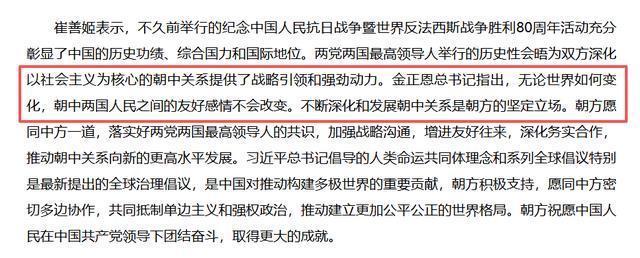 短短一个月内,朝鲜外相崔善姬两度踏上访华行程,4天的密集活动里,她不仅与中国外长王毅深入会谈,更带来了金正恩的重要口信。 这反常的访华频率、特殊时间点(恰逢朝鲜劳动党建党80周年阅兵筹备),再加上涉及中朝协作、核政策的关键信息,处处透着不简单。 美俄日韩到底该从这趟行程里读出哪些信号? 崔善姬此次访华,首先把中朝协作的基调定得明明白白。 会谈中,她带来了金将军的“口信”。 她表示,朝鲜领导人指出:“无论世界如何变化,朝中两国人民之间的友好感情不会改变,不断深化和发展朝中关系是朝方的坚定立场。”